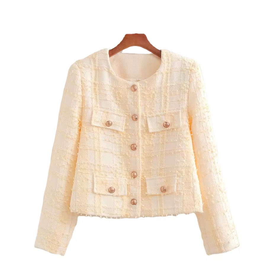 Jacka . Rund krage. Långärmad. Detalj med knappslå fram. Knäppning fram med knappar.